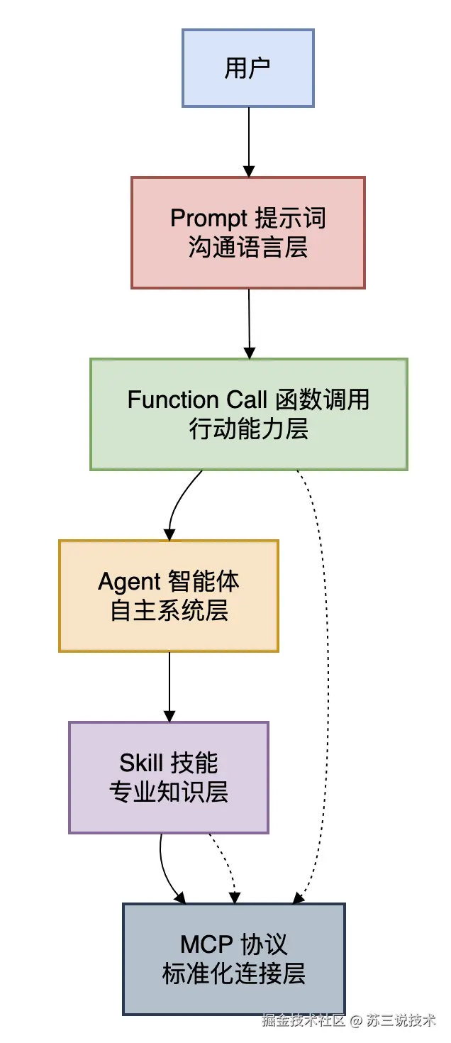 我发现里面有很多概念有些小伙伴有点分不清楚,比如:Prompt、Agent、Function Call、Skill、MCP等。
