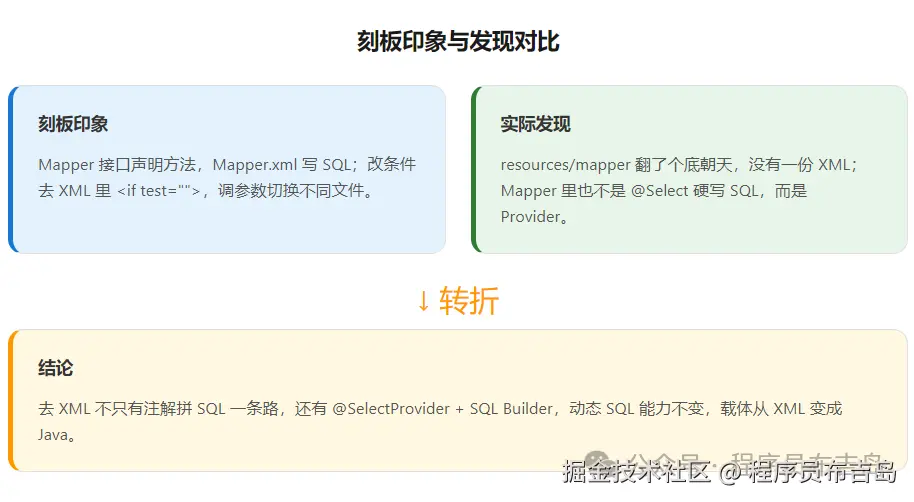 • 但“拼 SQL 的载体”从 XML 变成 Java Provider 方法
